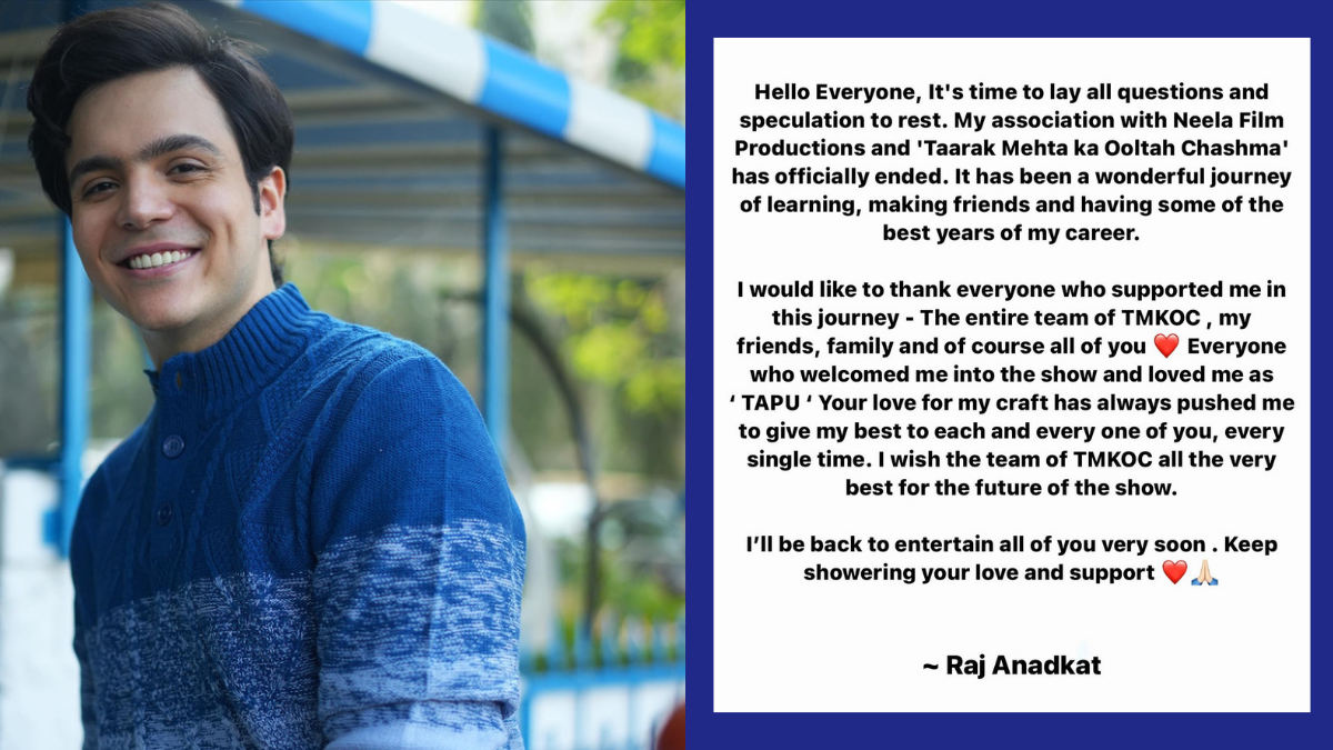 Raj wrote in the Instagram post, “Hello Everyone, It’s time to lay all questions and speculation to rest. My association with Neela Film Productions and Taarak Mehta ka Ooltah Chashmah has officially ended. It has been a wonderful journey of learning, making friends and having some of the best years of my career.”