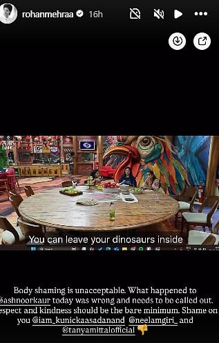 Taking to his Instagram story, Rohan shared the video and wrote, “Body shaming is unacceptable. What happened to @ashnoorkaur today was wrong and needs to be called out. Respect and kindness should be the bare minimum. Shame on you, @iam_kunickaasadanand, @neelamgiri_, and @tanyamittalofficial,” giving a thumbs down emoticon.
