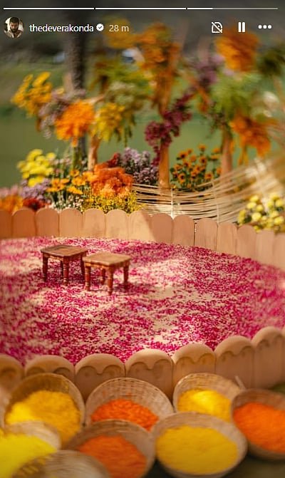 After hosting fun-filled pre-wedding events, including a friendly cricket match dubbed the ‘Virosh Premier League’, the celebrations have now shifted to more intimate and sacred rituals. Vijay and Rashmika recently shared glimpses of their Haldi ceremony on their respective Instagram Stories, offering fans a peek into the beautifully curated setting.